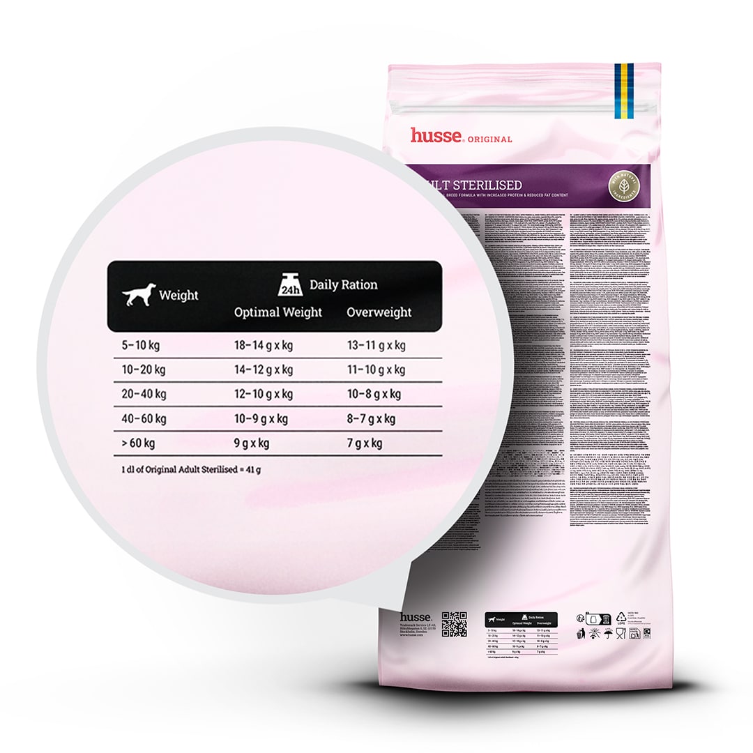 Energikontroll – En balanserad relation mellan protein och fett hjälper till att stödja viktkontroll efter sterilisering.